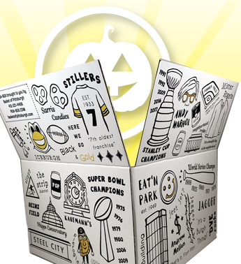The ONE & ONLY……. PGH-BOX! (Only Available at BOP!) Every PGH-BOX captures and embodies the spirit of Pittsburgh in a simple yet unique way. From the iconic images on the outside, to every ‘Burgh favorite inside, this exclusive box is truly an original – a local one of kind. Every twist & turn of the box brings genuine conversations, happy memories and the occasional internet search! In the end, the results are typically a giggle, a smile or an a-ha moment! It’s not just a gift, it’s an experience. The PGH-BOX is the ultimate gift for any TRUE Pittsburgher (or Yinzer). Near or far, send a smile today!