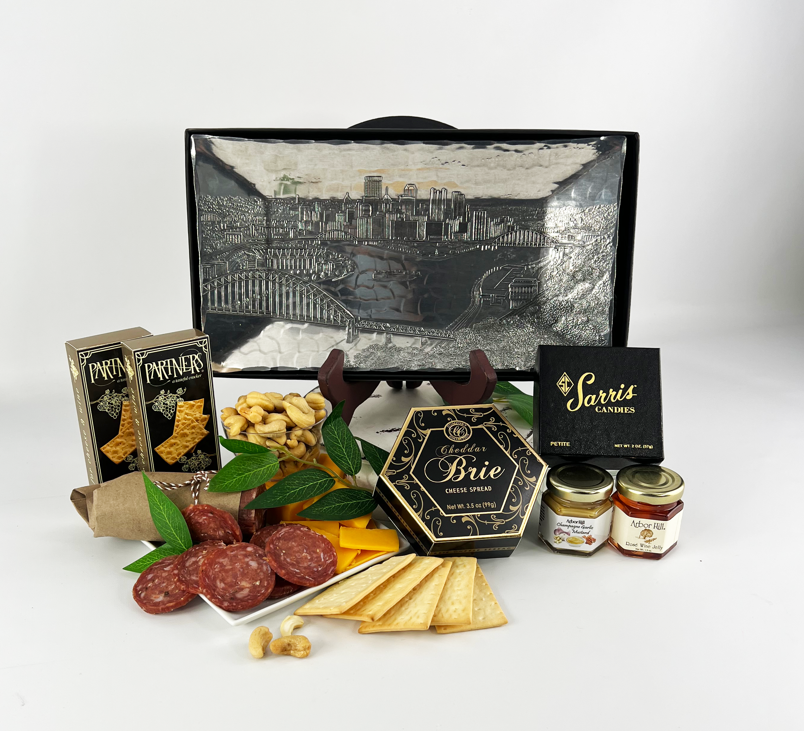 NEW DESIGN!! TOP SELLER!! This is a high-class Pittsburgh gift featuring the hand forged Pittsburgh skyline platter by Wendell August Forge. WAF is a historic staple in Western PA that produces superior products. These popular contents are strategically placed on the handcrafted metal platter, shrunk into place and finished with a ribbon. This is another one of a kind Pittsburgh gift by Basket of Pittsburgh!