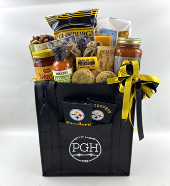AUTHENTIC PITTSBURGH STEELER GIFTS. These gifts are designed and put together by long-time black and gold fans. After two quarters of white-knuckle, edge-of-your-seat Sunday football, you need a time out! Sit back and relax, watch the half time show and refuel with this basket of football food and snacks. This will fill you up and give you energy for the second half of Steelers domination of the field! Favorite gift of Steeler Nation! Go to customize your gift and add a Terrible Towel or Steeler Hat!