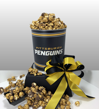 A simple gift for your favorite Pittsburgh Penguin fan! It is packed to the top with the popular Pittsburgh Popcorn and wrapped up with a black and gold bow along with a custom printed note card. Send this to a special Pens fan today!