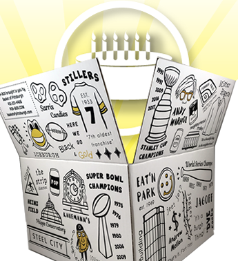 The ONE & ONLY……. PGH-BOX! (Only Available at BOP!) Every PGH-BOX captures and embodies the spirit of Pittsburgh in a simple yet unique way. From the iconic images on the outside, to every ‘Burgh favorite inside, this exclusive box is truly an original – a local one of kind. Every twist & turn of the box brings genuine conversations, happy memories and the occasional internet search! In the end, the results are typically a giggle, a smile or an a-ha moment! It’s not just a gift, it’s an experience. The PGH-BOX is the ultimate gift for any TRUE Pittsburgher (or Yinzer). Near or far, send a smile today!