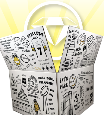 The ONE & ONLY……. PGH-BOX! (Only Available at BOP!) Every PGH-BOX captures and embodies the spirit of Pittsburgh in a simple yet unique way. From the iconic images on the outside, to every ‘Burgh favorite inside, this exclusive box is truly an original – a local one of kind. Every twist & turn of the box brings genuine conversations, happy memories and the occasional internet search! In the end, the results are typically a giggle, a smile or an a-ha moment! It’s not just a gift, it’s an experience. The PGH-BOX is the ultimate gift for any TRUE Pittsburgher (or Yinzer). Near or far, send a smile today!