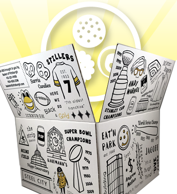The ONE & ONLY……. PGH-BOX! (Only Available at BOP!) Every PGH-BOX captures and embodies the spirit of Pittsburgh in a simple yet unique way. From the iconic images on the outside, to every ‘Burgh favorite inside, this exclusive box is truly an original – a local one of kind. Every twist & turn of the box brings genuine conversations, happy memories and the occasional internet search! In the end, the results are typically a giggle, a smile or an a-ha moment! It’s not just a gift, it’s an experience. The PGH-BOX is the ultimate gift for any TRUE Pittsburgher (or Yinzer). Near or far, send a smile today!