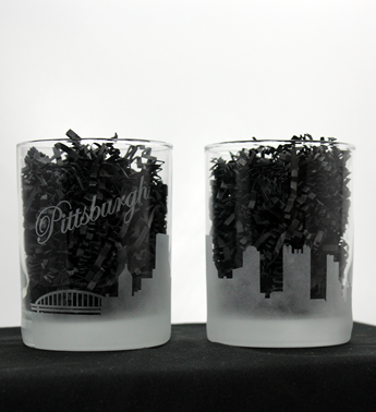 ~ Custom engraved and frosted Pittsburgh Skyline Engraved rocks glass.