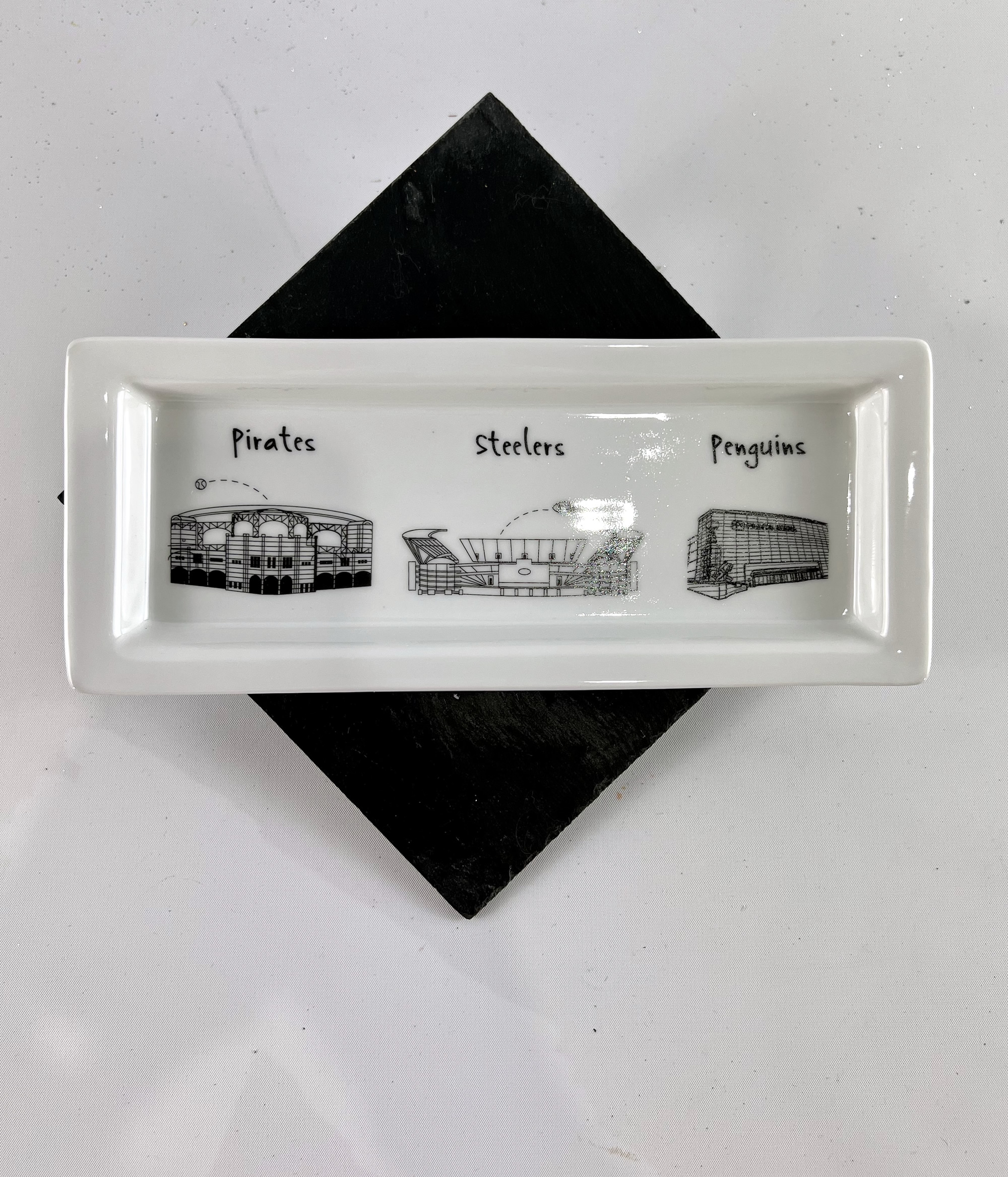 Basket of Pittsburgh offers the best gifts. This popular line is available as a stand-alone or as a special addition to any basket! – The DISH Pittsburgh Collection – Stadium Series Rectangle Plate — Popular!!