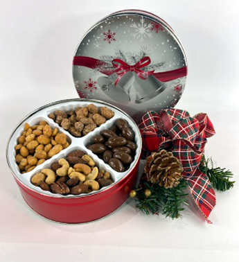Silver bells, silver bells… it’s Christmas time in Pittsburgh. This festive tin includes honey roasted peanuts, fancy mixed nuts, cinnamon almonds, and chocolate covered almonds. Check out our Snowy Drive tin for similar contents but with a different style.