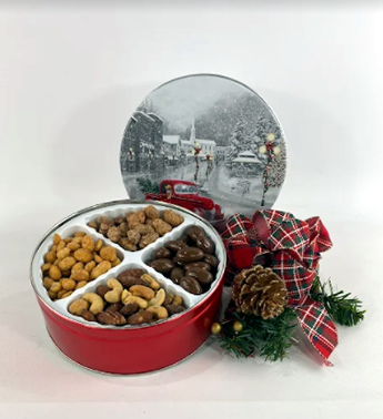 There is no place like home for the holidays. Send the feeling of home with this festive tin that includes honey roasted peanuts, fancy mixed nuts, cinnamon almonds, and chocolate covered almonds. Check out our Silver Bells tin for similar contents but with a different style.